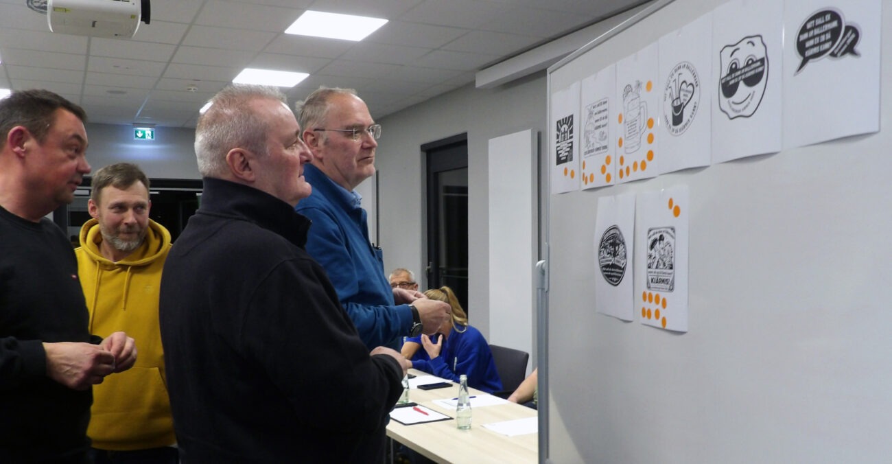 Jede Kirmesgruppe und jedes Gremium erhielt zur Stimmabgabe zwei Klebepunkte, mit denen man seinen Favoriten kennzeichnen konnte. Mit dem Ergebnis, dass der Vorschlag von Christina Maurer mit 22 Punkten, Platz 2 lag bei 18 Punkten, das Rennen machte. Bei der Auswahl zur Farbgestaltung, sprich Grundfarbe der Plakette sowie Schriftfarbe, gab es neun Vorschläge – darunter, wie sollte es auch anders sein, die Farbkombinationen einiger Fußballclubs. Per Handzeichen wurde nun darüber abgestimmt und die Versammlung entschied sich mehrheitlich für die Kombination Grundfarbe weiß, Schriftfarbe schwarz.