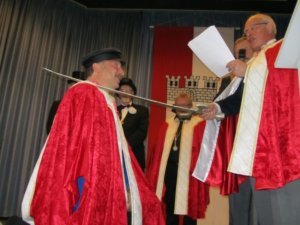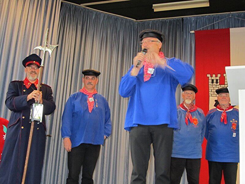 Wenn die Hasper zum Erbsensuppenessen in der Kirmeszeit einladen, dürfen sich die Gäste auf ein kurzweiliges Ereignis freuen. So war es auch Samstag Vormittag, und diesmal war es auch für Gevelsberg eine besondere Veranstaltung, denn einem Gevelsberger wurde von höchster Stelle eine tragende Rolle im Hasper Kirmesleben zugesprochen. Michael Sichelschmidt, „ehemaliger Hammerschwinger und heutiger Kirmespräsident“ wie ihn Dietmar Thieser in seinen ehrenden Worten vorstellte, darf sich seit Samstag „Hasper Wachholderritter und Träger des Hasper Wachholderlöffels“ nennen. Mit dieser Ernennung geht eine Lebensverpflichtung einher, denn Michael Sichelschmidt muss nun immer, wenn die Hasper Kirmes ruft, die Grenzen überschreiten und herbeigeeilt kommen. Adel verpflichtet.