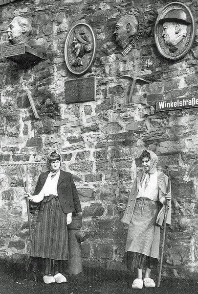 Unterhalb der „Kirmesmauer“ standen „Bäuerinnen“ oder „Bauer und Bäuerin“ – Mitglieder der „Kirmesgruppe Hippendorf“ – Die Bruchsteinmauer mußte im Jahre 1976 abgebrochen werden, da sie baufällig war. Eine Reparatur oder eine Neuerrichtung in gleicher Form war der Stadt Gevelsberg zu aufwändig.